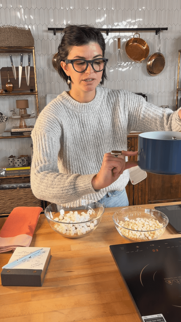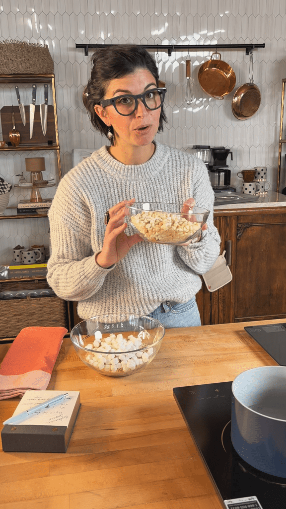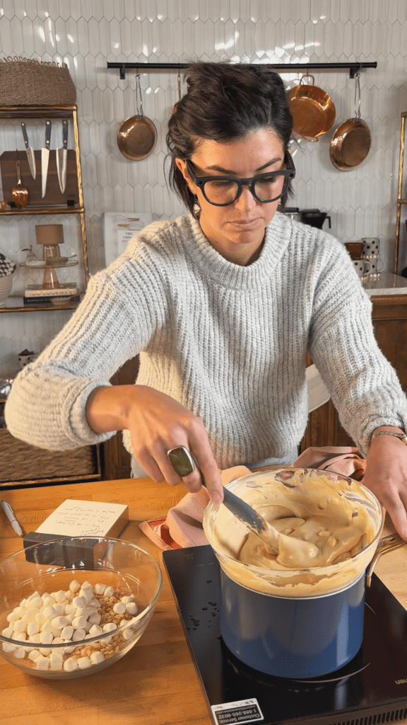 Using a double boiler allows the chocolate to melt slowly and evenly, without scorching or seizing. The indirect heat keeps everything silky smooth, so the peanut butter and white chocolate blend together into a rich, glossy base that coats every crisp of cereal and every fluffy mallow just right.