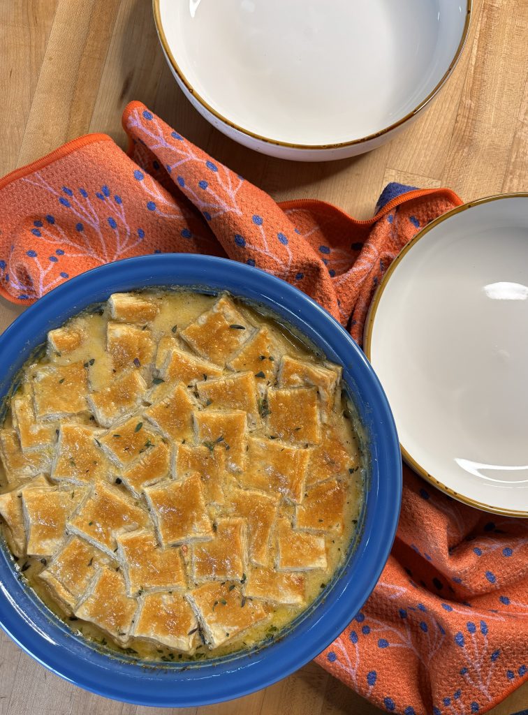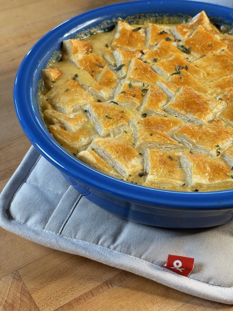 Instead of a traditional full crust, this pot pie is topped with puff pastry squares, creating a light, flaky finish that’s both beautiful and practical. Each square bakes up golden and crisp, giving you just the right amount of pastry in every bite without overwhelming the filling.
