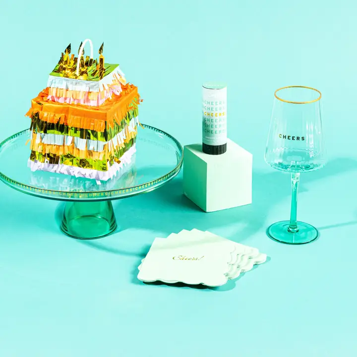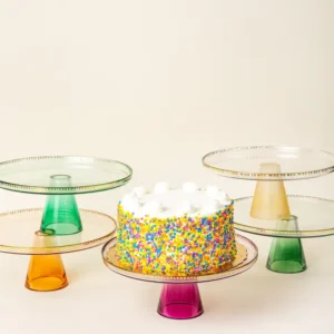 These colored glass cake stands are the perfect addition to any party. This stand is made from seafoam green lead-free crystal glass. It reads CHEERS in gold foil around the rim. Dimensions: 11″ W x 5″ H