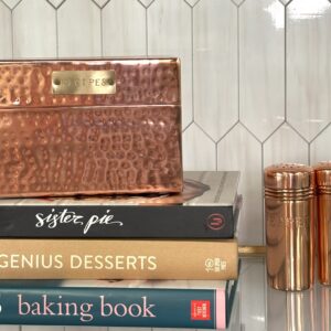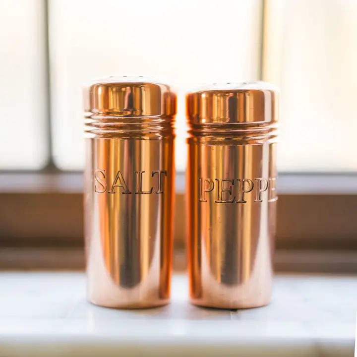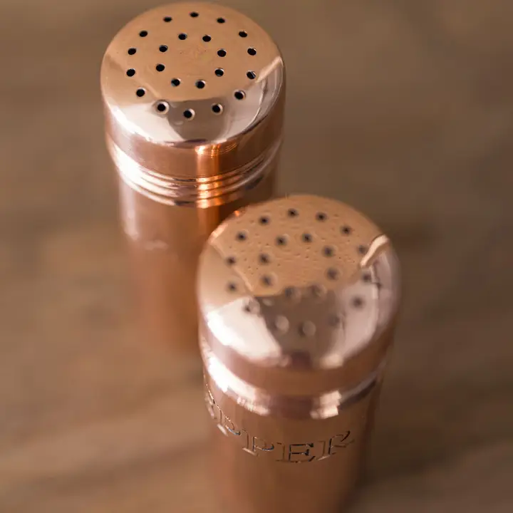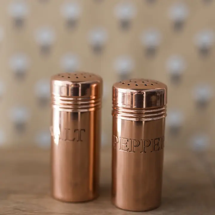 Made from high-quality, durable copper, each shaker is expertly hand-formed by skilled artisans, ensuring a unique and timeless piece for your kitchen. The warm, glowing hue of the copper ages beautifully over time, developing a rich patina that enhances its charm. The shakers are designed in house with easy dispensing and a sleek, minimalist shape that complements any table setting. Perfect for everyday use or as a thoughtful gift, these copper salt and pepper shakers are a functional and stylish addition to your home. +Designed in-house +Hand made +Food-safe plastic interior liner +Hand wash recommended