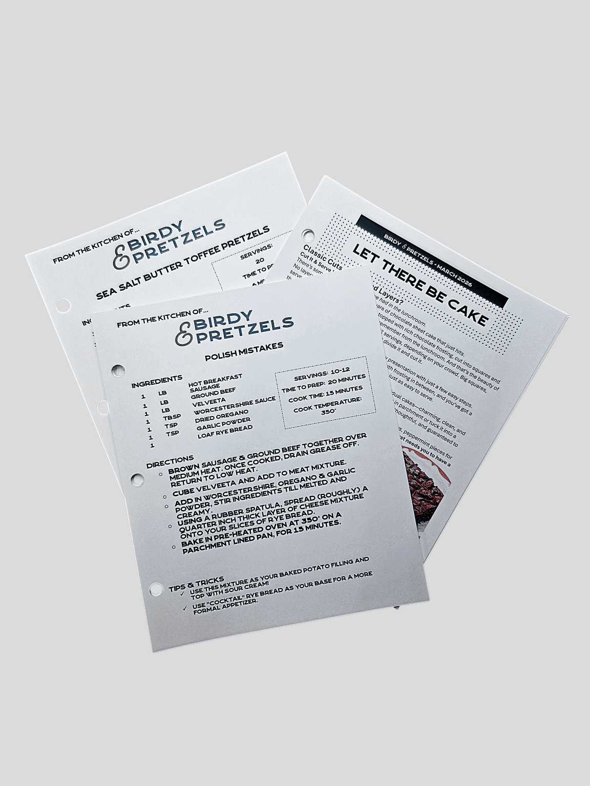 Bring your favorite Birdy & Pretzels recipe to life with a custom-printed card designed to last. Whether it’s a special request, a seasonal favorite, or a recipe you never want to lose, we’ll print it on our premium Revlar™ synthetic paper—made to handle real kitchen life.