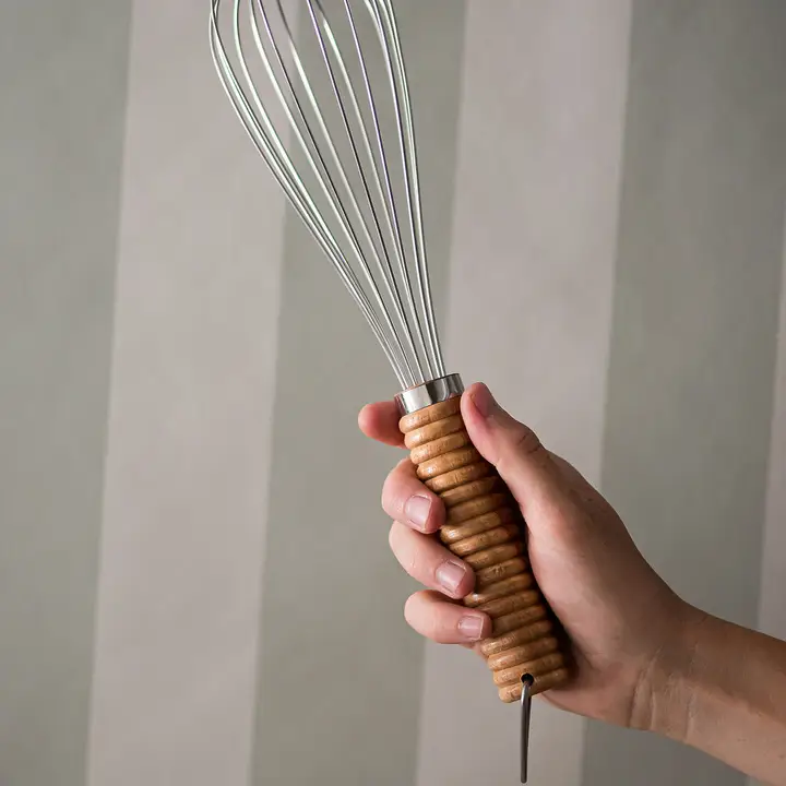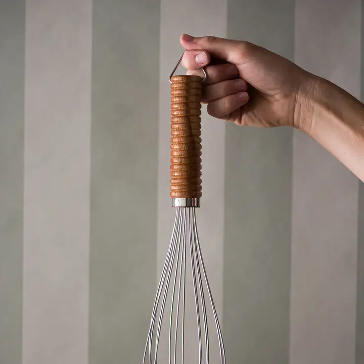The everyday stainless steel whisk, featuring a knurled wooden handle. A classic design that is meant to be as beautiful as it is functional. The knurled handle gives the whisk a good grip as well as adds interest to a simple kitchen tool.