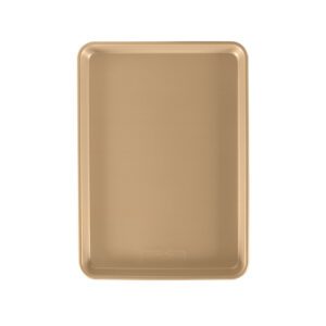 Nordwicware’s Nonstick Naturals® Aluminum Bakeware has premium gold interiors nonstick surface for easy release and cleaning. Encapsulated galvanized steel rims prevent warping. Made of aluminum for even heating and superior baking performance. A necessity for any chef’s kitchen, this half sheet pan is a great size for everyday cooking endeavors. Proudly made in the USA.
