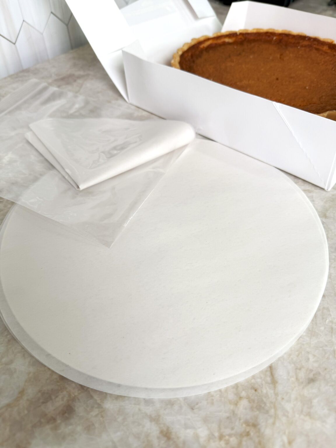 A bundle of 10 parchment rounds. Line your pie pan with this parchment sheet and slide your baked pie right off its base with ease!