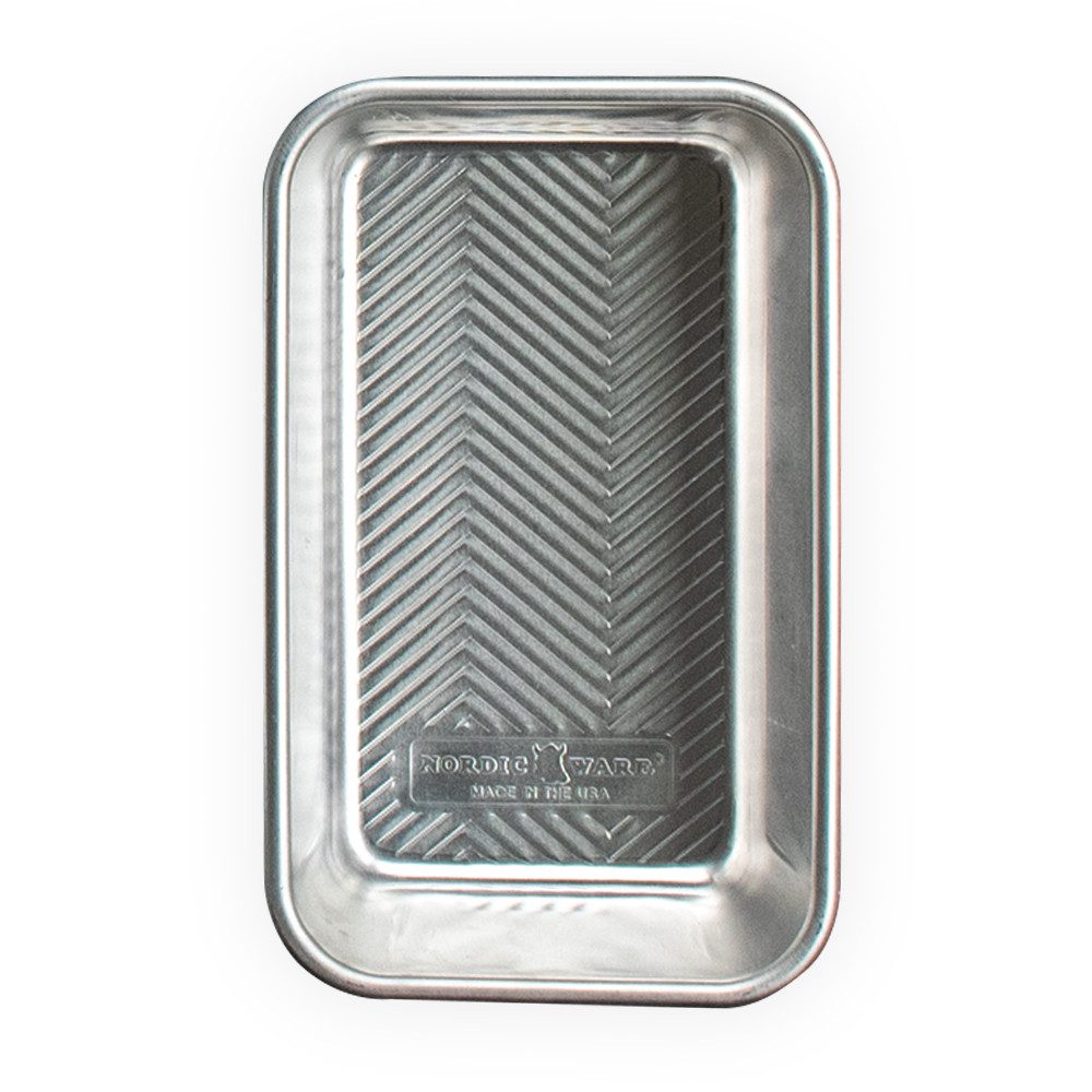 Embossed Natural Aluminum Bakeware, by Nordicware, enhances the look and performance of our hugely popular baking pans. Exclusive Prism grid adds durability and provides easy release while also improving air flow for uniform crisping. Encapsulated galvanized steel rims prevent warping. This generously-sized 1.5 lb loaf pan with textured bottom promotes airflow beneath bread for a crisp crust. Think beyond bread- convenient size for many other uses, including meatloaf, roasting vegetables, and mini rectangular deep dish pizzas. Sized to fit into most compact and toaster ovens as well as conventional ovens, this loaf pan is larger than most.