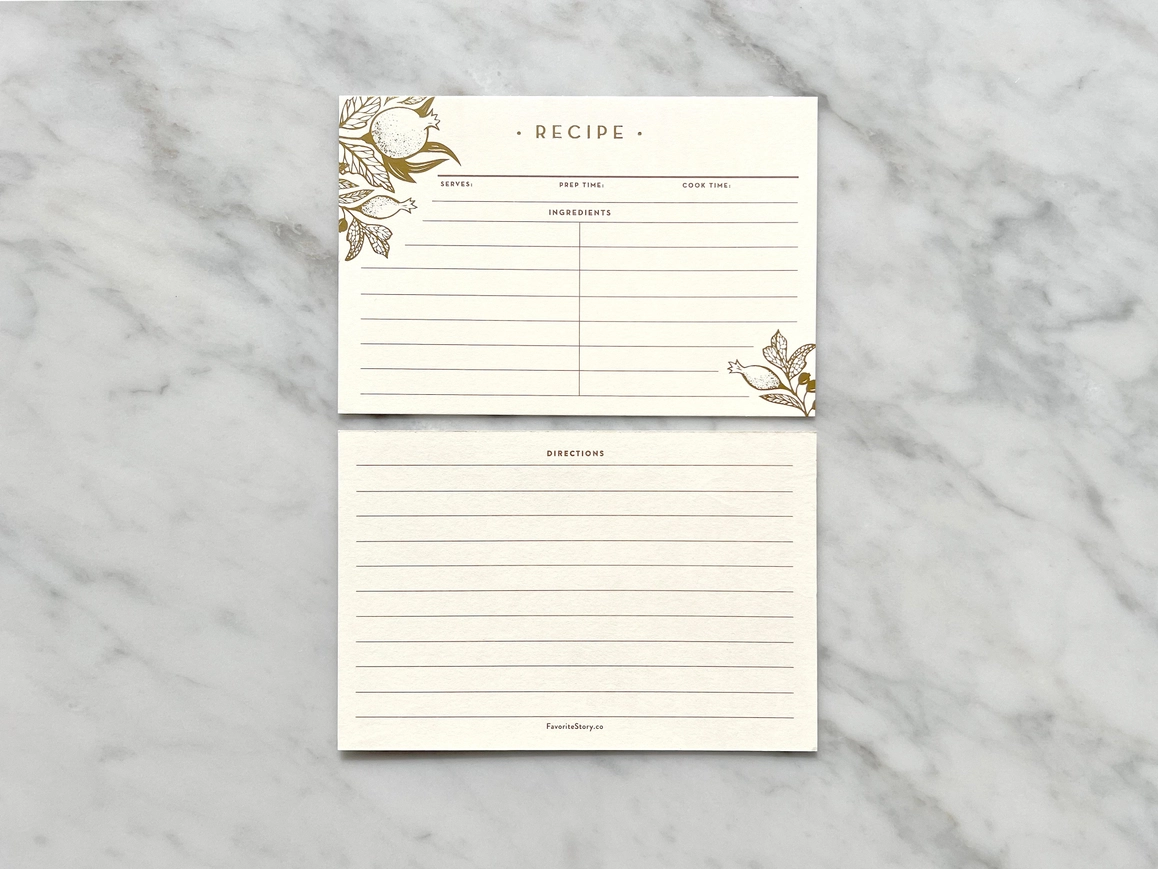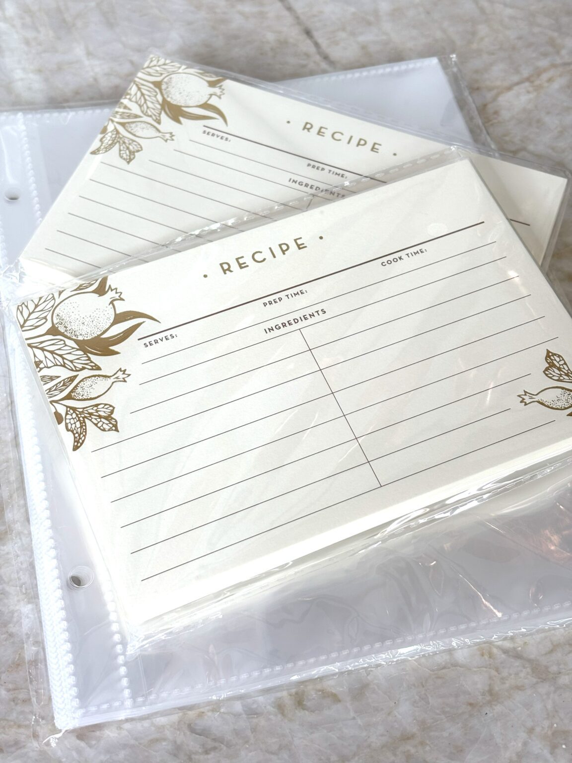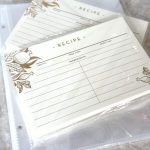 A pack of 50 floral foil stamped, 4″X6″ recipe cards and 25 clear protective sleeves. Sleeve is made to fit 8.5″X9.5″ binder
