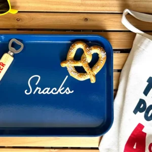 Poolside, Beachside, Picnic in the Park, or lazing on the Couch. This vintage-inspired Snacks tray is durable and long-lasting fiberglass. Measures 14″ x 10.5″. Made in USA. Dishwasher Safe