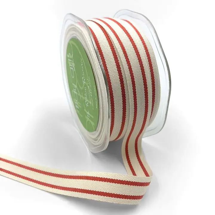 | This 5/8 inch wide by 30 yard roll of natural cotton ribbon features two stripes. Tie on gift bags and party favors. Due to being a woven cotton, this ribbon is thick. Fiber Content: 90% Cotton 10% Polyester |