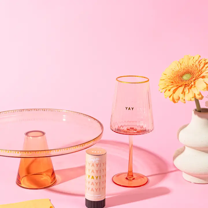 These colored glass cake stands are the perfect addition to any party. This stand is made from coral lead-free crystal glass. It reads YAY in gold foil around the rim. Dimensions: 11″ W x 5″ H