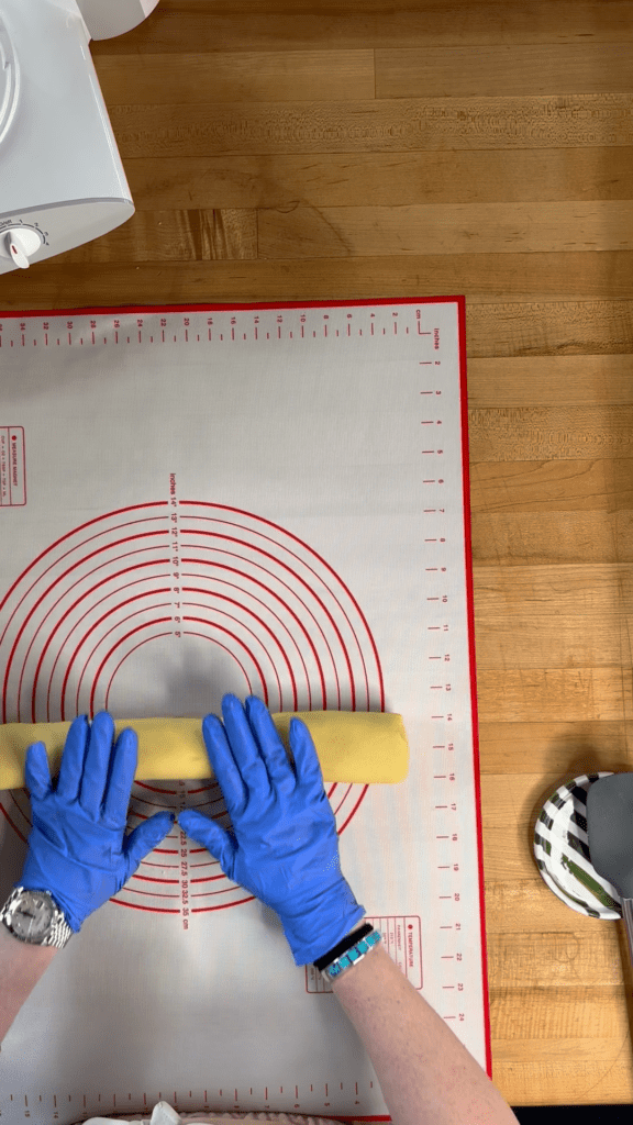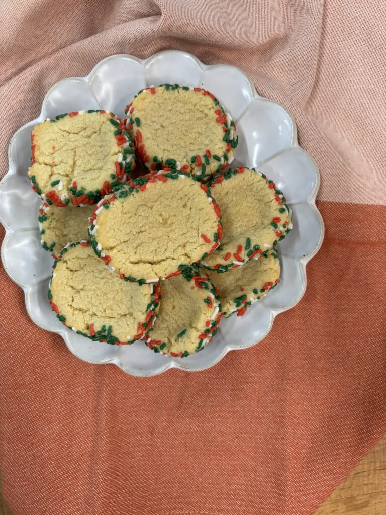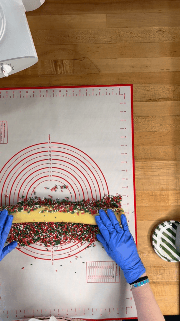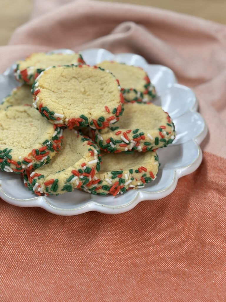 Rolling the dough into a log, coating it in sprinkles, and slicing with a bench scraper allows multiple cookies to be portioned quickly and evenly. It’s a faster method overall and creates clean edges with a sprinkle-forward finish — perfect when time is short or presentation matters.