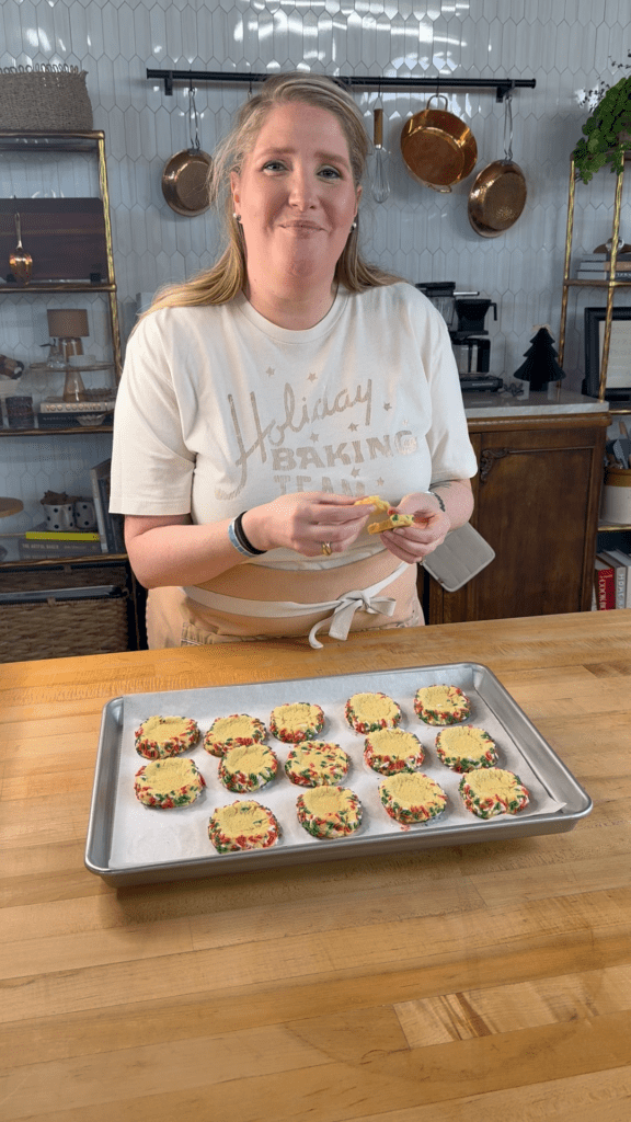 The sprinkles are mixed directly into the dough, then portioned with a cookie scoop. It’s straightforward and familiar, producing soft, chewy cookies with sprinkles throughout and a more casual, rustic look.