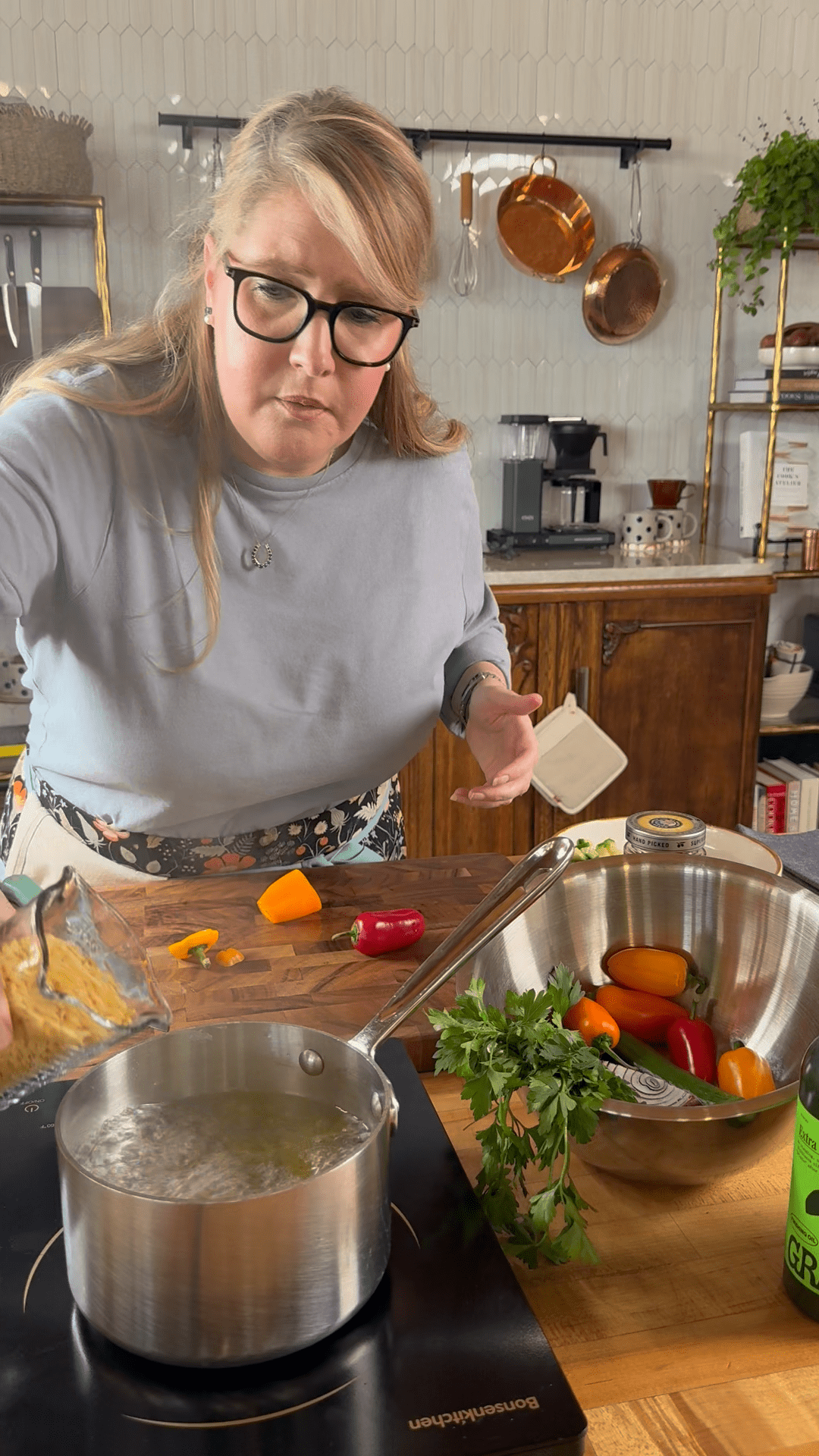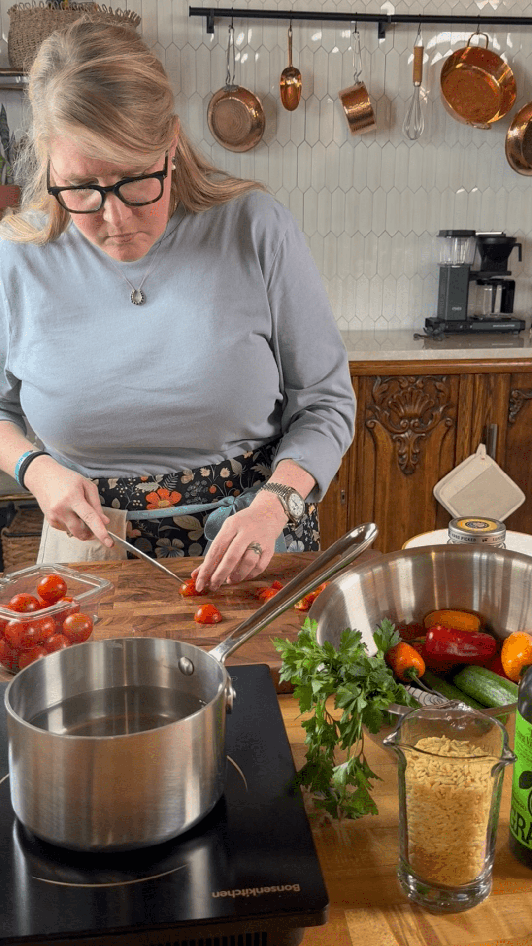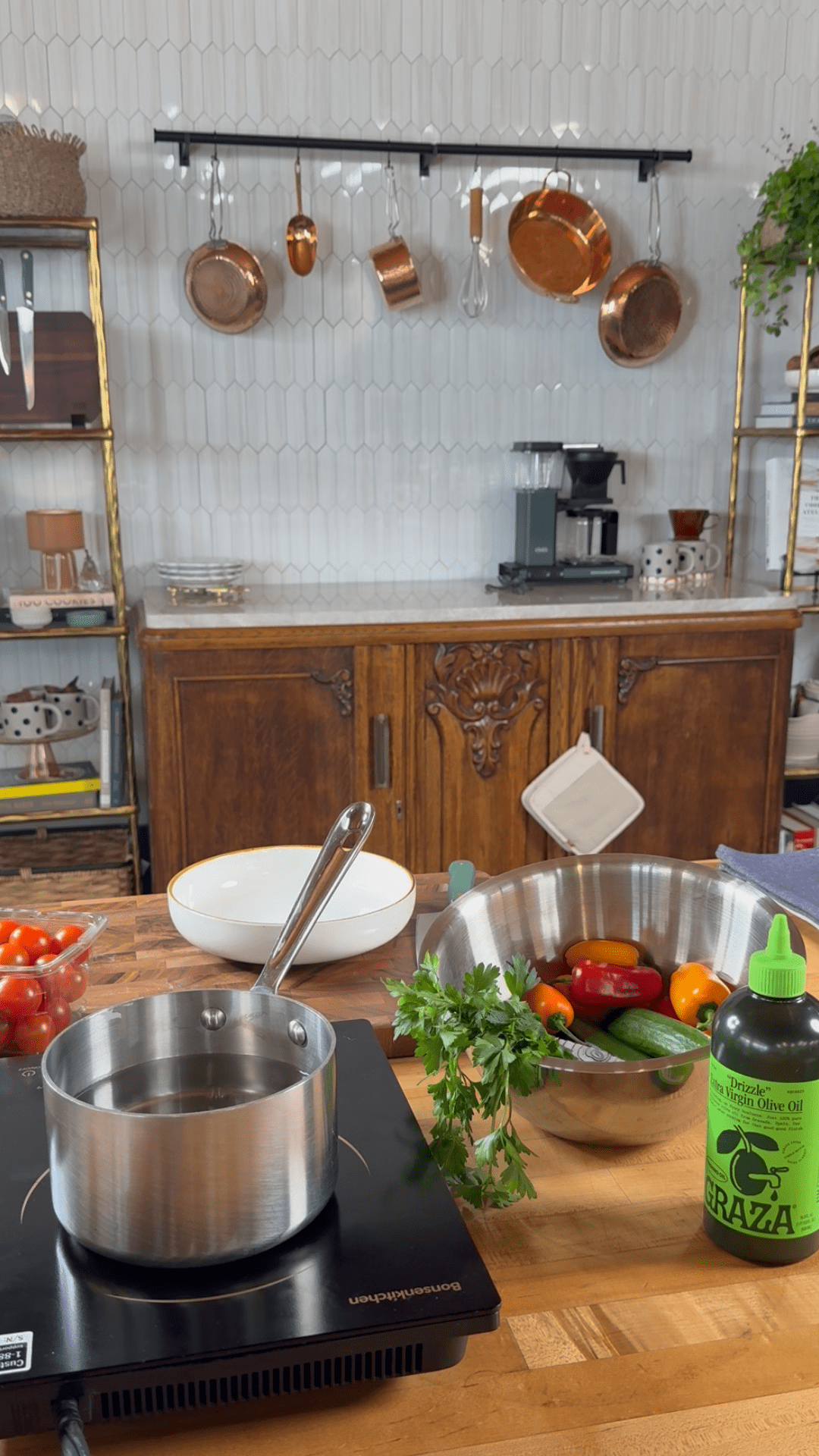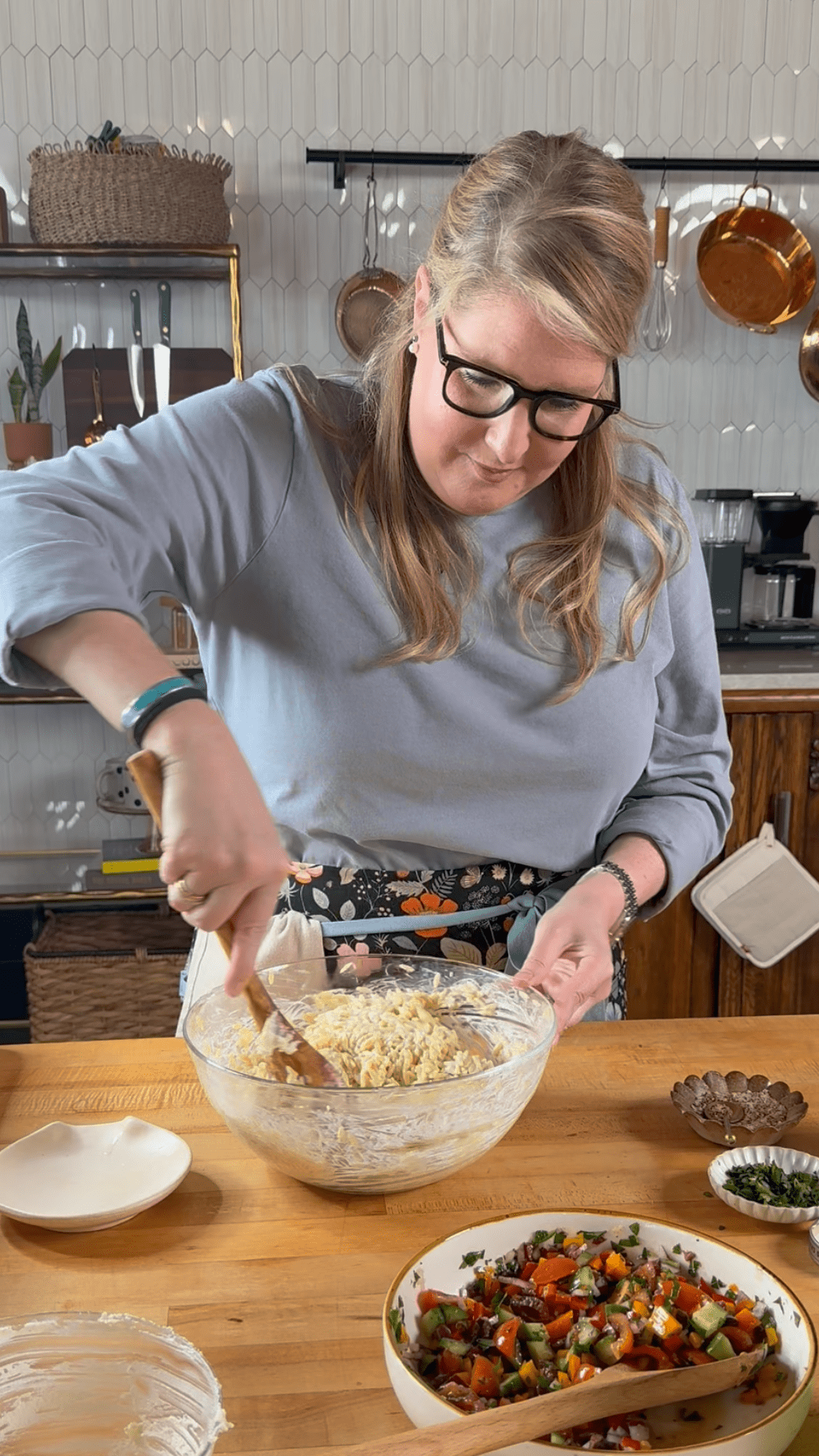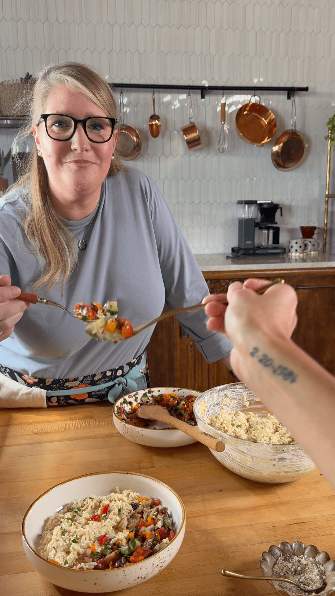 Our Birdy & Pretzels Whipped Feta is the heart of this recipe — smooth, airy, and perfectly balanced with a hint of lemony brightness. It’s the ideal base for tossing into warm orzo, coating every piece with creamy goodness while letting the fresh veggies shine.